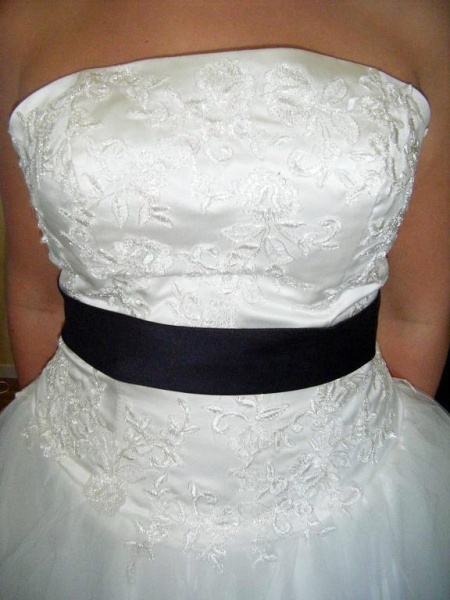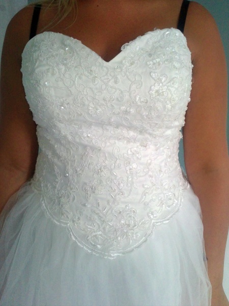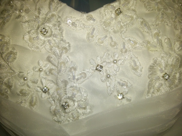 Var dubbel-trippel-jättenoga med att tala om att du enbart vill ha pärlor då! Ofta sätter de ju pärlor och paljetter tillsammans på klänningarna :P Bara så de inte missförstår :) Jag försökte ta en bild på min överdel och där är det paljetter, pärlor i olika form och storlekar och även.. jag vet inte vad man kallar det, strass? över spets. Bilden blev lite gul (bra blixt :P), men du kanske ser ändå.
