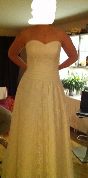 Den måste kortas av, för den är för lång. Släpet måste kortas ganska mycket också. Sen måste vi sy in den längs sidorna vid höften. Ska inte vara så "puffig" där, utan mera rak i modellen. Som det är nu så är det massor med tyg, så jag hoppas att det är lätt att ta bort lite och tajta till den. Isydda underkjolen ska sprättas bort och se om jag gillar fallet bättre då. Sen ska vi sy dit ett brett sidenband över skarven i midjan som dom gjort. I originalet så var den i ett stycke, men nu har dom delat klänningen i midjan så det nästan blir "prinsess-puff-look" och det är inte alls ok. Sen är den liiiite stor över bysten, men där hoppas jag på att hitta en BH som fyller ut ett par kupstorlekar Skrattande Kruxet med allt detta är ju att över satinet så är det jättejättefin spets som också måste justeras ihop med resten av ändringarna. Inte det lättaste, kan jag tänka mig.... Men jag vill så himla himla gärna att dom ska säga "ja, men detta fixar vi plättlätt!" när dom tittar på den....